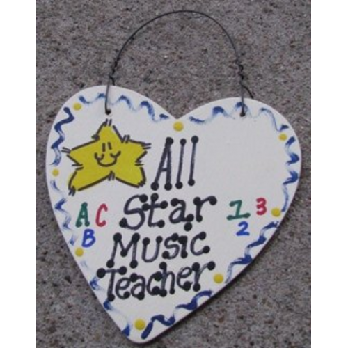 Perfect gift for that special school employee. Heart Shaped with a Yellow Star. Let that school employee know that they are an All-Star. This heart has All Star Music Teacher written on it. Handmade in Laporte, Texas
