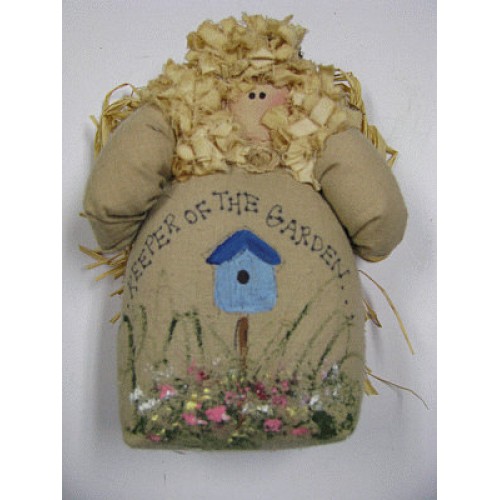 Hand Painted Muslin Material Stuffed Stands. Has raffia for wings. Has a Light Blue Birdhouse painted on the front with flowers in the garden and says "Keeper of the Garden" 123BLB-Birdhouse Light Blue Handmade in America Measures 6 1/4"H x 4 3/4"W x 2 1/4"D