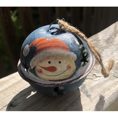 989228BS Blue Bell Ornament with Snowman Red Hat Metal Christmas Ornament measures 2 1/2 inches round and hangs by Jute.