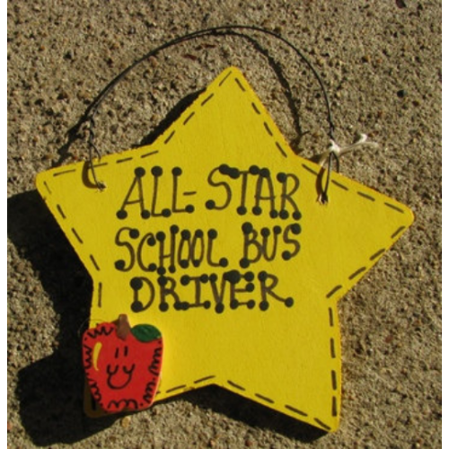Yellow Star with stitching around the edges and a apple in the lower left corner.  Hangs by Wire.  Show your favorite school employee that they are an All-Star.  This star has All Star School Bus Driver written on it and is Handmade in LaPorte, Texas.  Measures 5 inches wide by 5 inches high