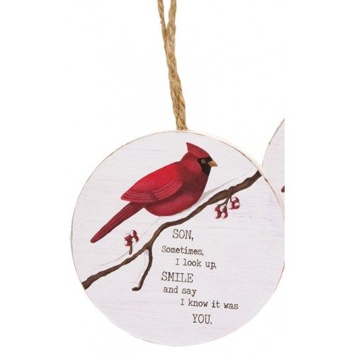 This round wooden ornament expressing sentiment for a departed Son alongside snowy winter cardinal. Includes a jute twine hanger and measures 3 inches, - Reads: "SON, Sometimes, I look up, SMILE and say I know it was YOU."