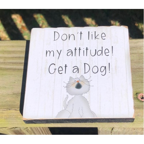 Don't like my attitude! Get a dog!" Item has a keyhole hanger on the back for wall display. Measures 4 inches squared.