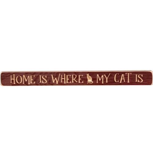 GE90322 Home is Where my Cat is engraved wood block, sign with burgundy paint and a distressed finish. It is engraved and reads, "home is where my cat is," in carved letters and it is accented by a carved silhouette of a cat. Its small size makes it perfect for displaying in any room. It is a freestanding sign that can be placed on any shelf, table, or countertop. Measures 18 inches wide by 1 3/4 inches high. Handmade in Ameica