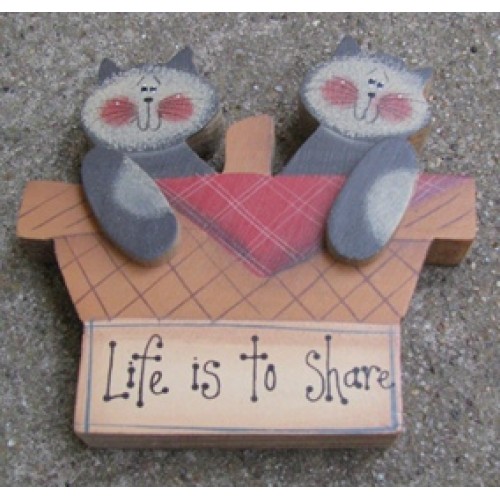 Wood Cat in Basket Shelf Sitter W2109LS - 2 Cats in a Basket, says on the basket Life is to Share and measures 4"W x 3 3/4"H x 1/2"D