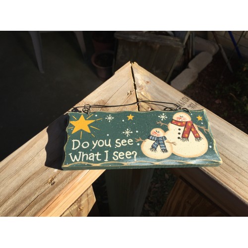 8711F - Do you see What I see? wood snowman sign, measures 6 3/4 inches wide by 2 3/4 inches high. hangs by wire