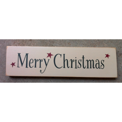 Merry Christmas Block is Stained on Back & Sides. The front is painted cream. Merry Christmas is stenciled in dark green with a red stars. Handmade in America Finish: Sanded edges create a worn look. Measures 11 inches L x 3 Inches High