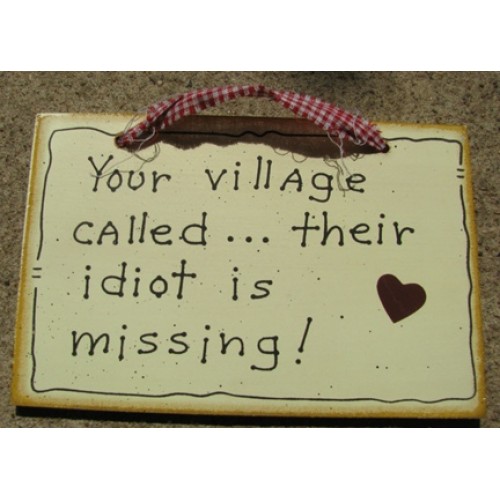 35233 - Your Village Called...their idiot is missing, wood sign, measures 6 inches wide by 4 inches high and has a reddish checkered gingham ribbon to hang by.
