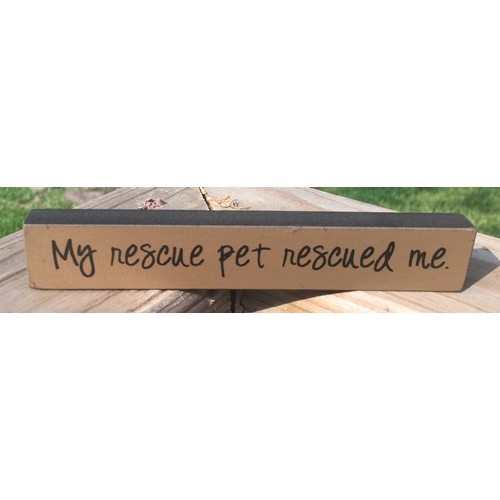 33188M - My Rescue pet rescued me mini wood block, measures 6 inches wide by 1 inch high, painted mustard gold with black lettering