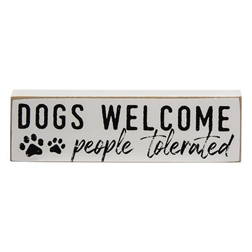 Mini Block freestanding, Block is made of wood and features a white finish with distressed edges. It reads, "dogs welcome people tolerated," in black text and it is perfect for dog lovers everywhere. Measures 1.5" high by 5" wide by .5" deep.