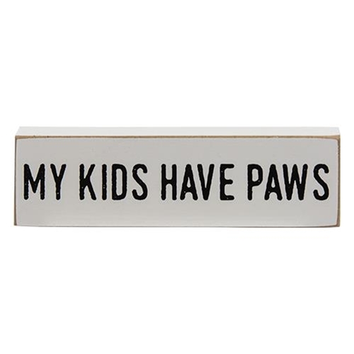 My Kids Have Paws Mini Block freestanding Block is made of wood and features a white finish with distressed edges. It reads, "my kids have paws" in black text and it is perfect for dog lovers everywhere. Measures 1.5" high by 5" wide by .5" deep.