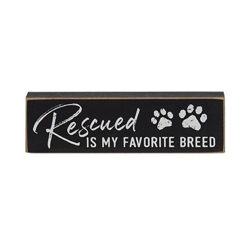 Block is made of wood and features a distressed black finish with the words, "rescued is my favorite breed" written in white text with paw print accents. It looks great on shelves, counters, or tabletops and measures 1.5" high by 5" wide by .5" deep.