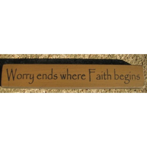 32317WG - Worry Ends Where Faith Begins, wood MINI block, measures 6 inches wide by 1 inches high. Painted Gold with black lettering