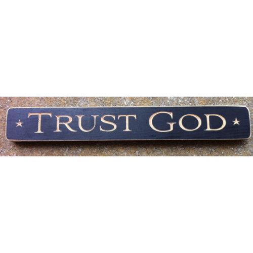 Trust God is Painted black and distressed wooden plaque, engraved with bold, looping script, accented with stars.