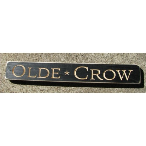 distressed wooden block, engraved with "Olde Crow" in bold, looping script, accented w/stars