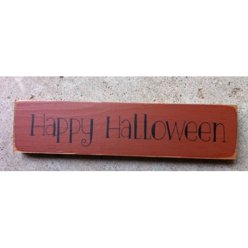 Sign is Stained on Back & Sides. The front is painted Orange, Happy Halloween is stenciled in Black Sign is stained on front to tone down the orange Finish: Sanded edges create a worn look 8 1/2Long x 2 Inches high Made in America