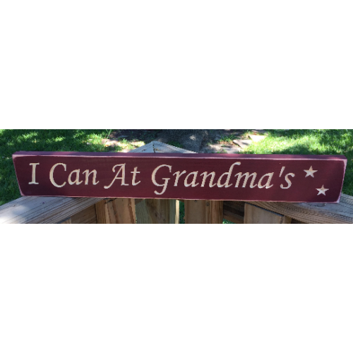 I can at Grandma's is Painted burgundy and distressed wood plaque, engraved with bold, looping script, accented with stars. Perfect for a mantle, shelf, over a door, or hanging on the wall. Handmade in America Carved notches in back make it easy to hang Size : 24"L and 3-1/2"H x 3/4" thick Finish: Sanded edges create a worn look.