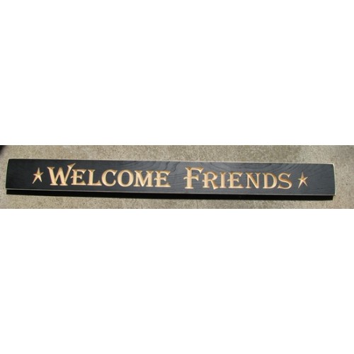 Engraved wood block 36WFB - Welcome Friends Painted Black, distressed wooden plaque, engraved with "Welcome Friends" in cheerful script, accented with stars Carved notches in back make it easy to hang Size : 36"L and 3-1/2"H x 3/4" thick Finish: Sanded edges create a worn look. Handmade in America