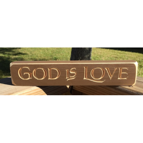 Primitive Engraved Wood Block is Painted brown and distressed, says "God is Love " engraved with bold Lettering. Perfect for a mantle, shelf or desk. Handmade in America Size : 9"L x 1 1/2"H x 3/4"D Finish: Sanded edges create a worn look.