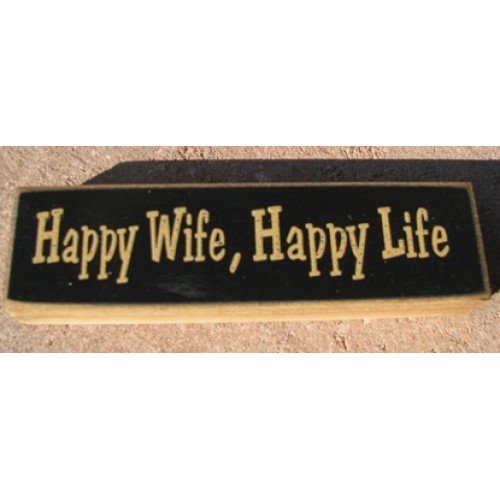 pb6142b-Happy Wife, Happy Life wood block, measures 5 1/2 inches long by 1 1/2 inches high, black with mustard gold letters. Handmade in America