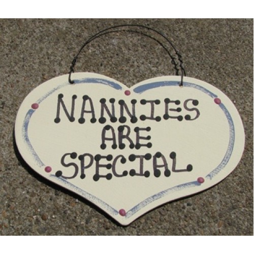 1002 - Nannies are Special wood heart, measures 5 3/4 inches wide by 4 1/4 inches high, hangs by wire and Handmade in Texas