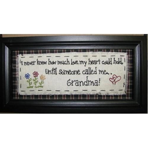 2083GR-I never knew how much my heart could hold until someone called me Grandma! stitchery, measures 12 inches wide by 6 inches high, Black Frame with saw tooth hanger on back of frame