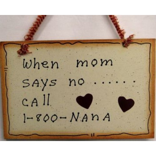 35223-When Mom Says No... Call 1-800 Nana, measures 6 inches wide by 4 inches high, hangs by a gingham ribbon