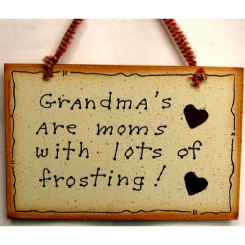 505-35231-Grandmas are moms with lots of frosting! wood sign, measures 4 inches high by 6 inches wide, hangs by gingham ribbon