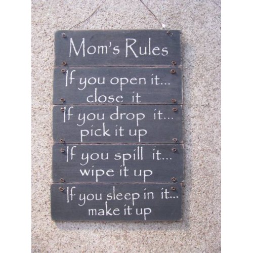 60494MR - Mom's Rules! Wood Sign. Sign has Mom's Rules If you open it...close it. If you drop it...pick it up. If you spill it...wipe it up. If you sleep on it...make it up, measures 11 3/4 inches high by 7 3/4 inches wide. Painted black with off white lettering. Hangs by wire