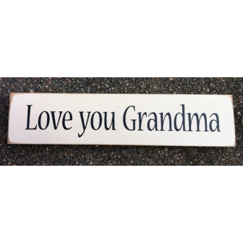 Primitive Country T2051 Love You Grandma wood block, measures 8 inches wide by 2 inches high, Sign is Stained on Back & Sides. The front is painted Cream. Love You Grandma is stenciled with Black. Finish: Sanded edges create a worn look. Handmade in America