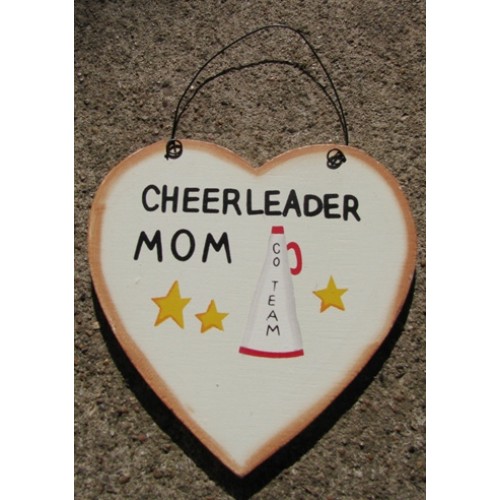 WD1900G - Cheerleader Mom wood sign, measures 4 inches wide by 4 inches high and hangs by wire