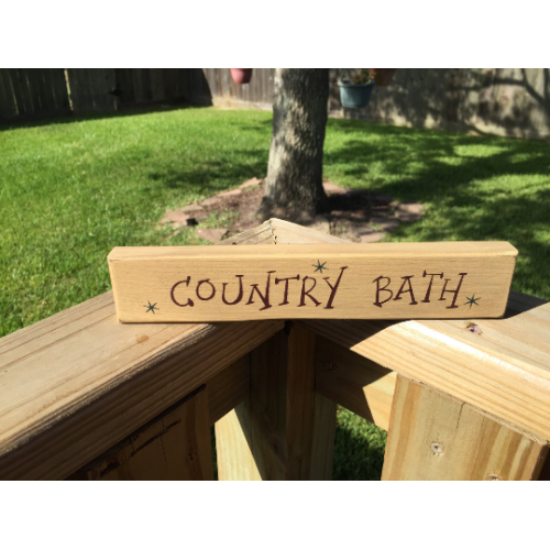 Country Bath is painted in burgundy on the front with blue stars