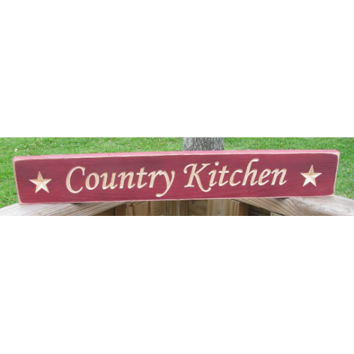 Primitive Engraved Wood Block Country Kitchen is Painted Burgundy and distressed wooden plaque, That says "Country Kitchen" engraved with bold lettering, accented with stars. Perfect for a mantle, shelf, over a door, or hanging on the wall. Handmade in America Size :24" long and 3-1/2" wide, 3/4" thick Carved notches in back make it easy to hang Finish: Sanded edges create a worn look.