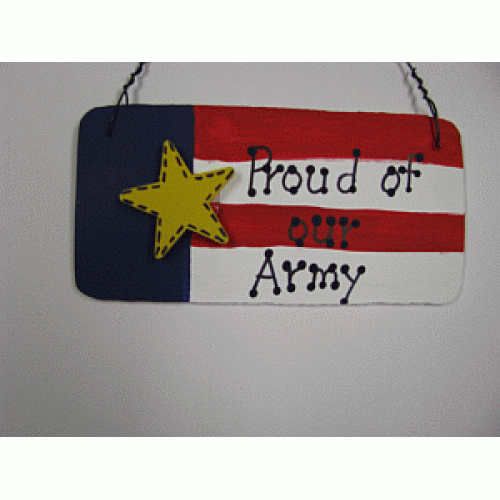 Patriotic Sign 10977A - Proud of our Army, measures 6 inches wide by 3 inches high. Hangs by wire and Handmade in LaPorte, Texas