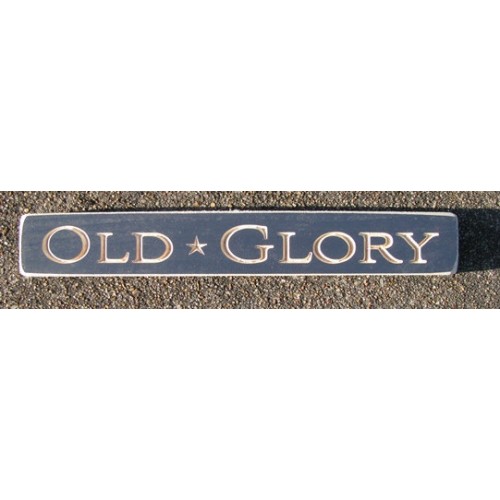 Painted Navy Blue and lightly stained, distressed wooden block, engraved with "Old Glory " in bold, looping script, accented w/stars