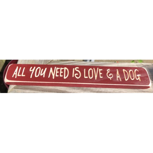 All You Need Is Love & A Dog wood Engraved Block, is a painted wood sign. It is burgundy and reads, "All You Need Is Love & A Dog," in carved lettering and it has distressed edges that reveal the natural wood underneath the paint. It is freestanding . Measures 12 inches wide by 1 1/2 inches high and HandMade in the America