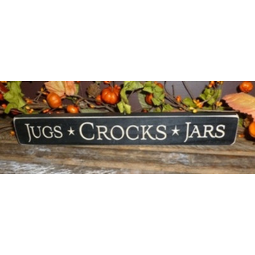 distressed wooden block, engraved with "Jugs Crocks Jars " in bold, looping script, accented w/stars