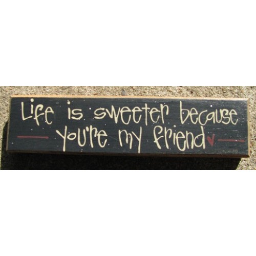 Life is sweeter because you're my friend Sign is Stained on Back & Sides. The front is painted Black with Cream Writing. Sprinkle with cream paint and burgundy heart Finish: Sanded edges create a worn look. Size: 7 inches by 1 1/2inches high