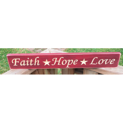 Painted Burgundy and distressed wooden plaque, That says "Faith Hope Love" engraved with bold lettering, accented with stars. Perfect for a mantle, shelf, over a door, or hanging on the wall.