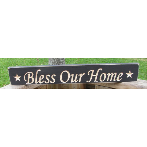 Primitive Wood Block is Painted Black and distressed, sign says "Bless Our Home" engraved with bold lettering, accented with stars. Perfect for a mantle, shelf, over a door, or hanging on the wall. Size :24" long and 3-1/2" wide, 3/4" thick Carved notches in back make it easy to hang Finish: Sanded edges create a worn look. Handmade in America