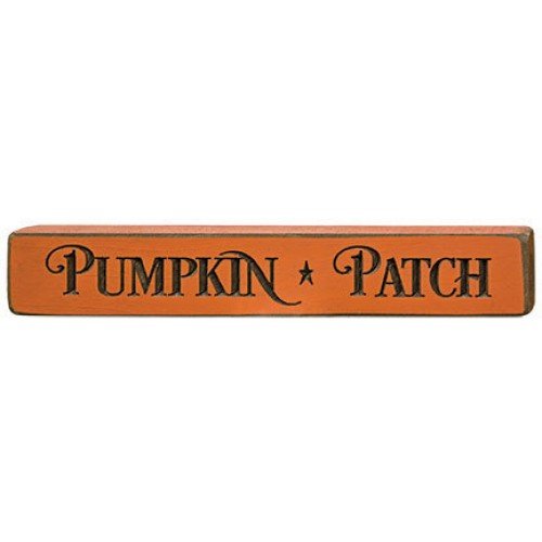 distressed wooden block, engraved with "Pumpkin Patch" in cheerful script, accented with stars.