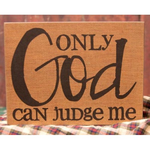 Judge Standing Box Sign. Has a rustic printed burlap background. Reads: Only God can judge me. Measures 8 x 6 inches. Hangs or sits.