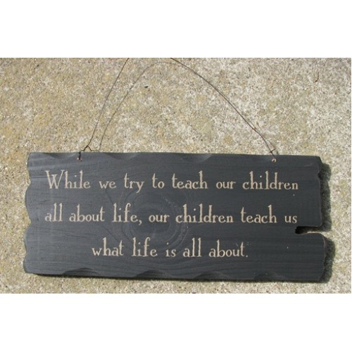 While we try to teach our children all about life, our children teach us what life is all about, measures 12 inches wide by 5 inches high. Hangs by wire Black in Color with off white lettering