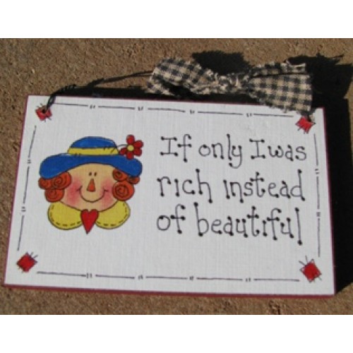 315F -If only I was rich instead of beautiful, measures 4 inches wide by 2 1/2 inches high, hangs by wire and Handmade in America