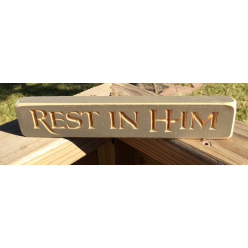 Rest in Him is Painted grey and distressed wood block sign, says "Rest in Him" engraved with bold Lettering. Perfect for a mantle, shelf or desk. Handmade in America Size : 9"L x 1 1/2"H x 3/4"D Finish: Sanded edges create a worn look.