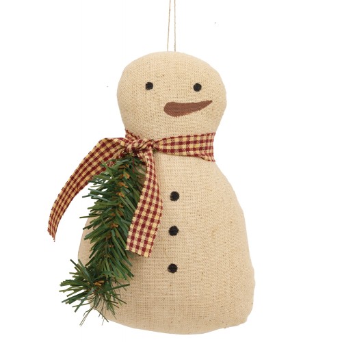 This small, primitive snowman is stuffed fabric with a gingham scarf and a painted face. A sprig of faux pine greenery accents this simple snowman which can be displayed as an ornament or propped up in a decorative tray arrangement. Measures 6 3/4 inches tall by 4 1/2 inches wide. - Material: Fabric-
