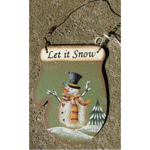 1394 - Tin Let It Snow Mitten Snowman ornament,measures 5 inches high by 3 1/2 inches wide. Hangs by wire