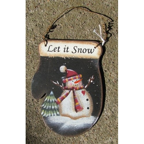 1395 - Tin Let It Snow Mitten Snowman ornament,measures 5 inches high by 3 1/2 inches wide. Hangs by wire