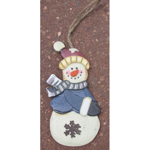 2813BV - Snowman blue Vest Snowman, Measures 4 3/4 inches high by 2 1/2 inches wide. Hangs by Jute