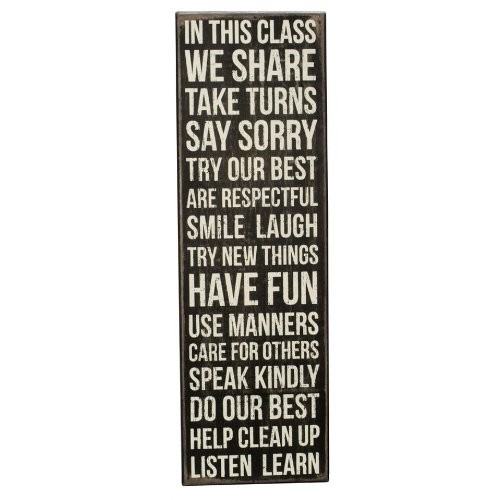 The Message: In this class we share, take turns, say sorry, try our best, are respectful, smile, laugh, try new things, have fun, use manners, care for others, speak kindly, do our best, help clean up, listen, learn Dimensions: 6 inches wide by 19 inches high. Made of wood, intentionally distressed and aged for a rustic look.