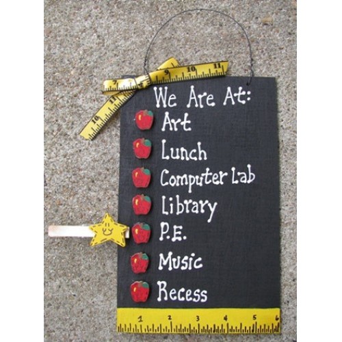 A great gift for the Teacher to let others know were the class is at, when not in their classroom. Comes with an star on the clothes pin that you can moved up and down the board that is painted black. Has a teacher ribbon and apples. With a ruler painted across the bottom.